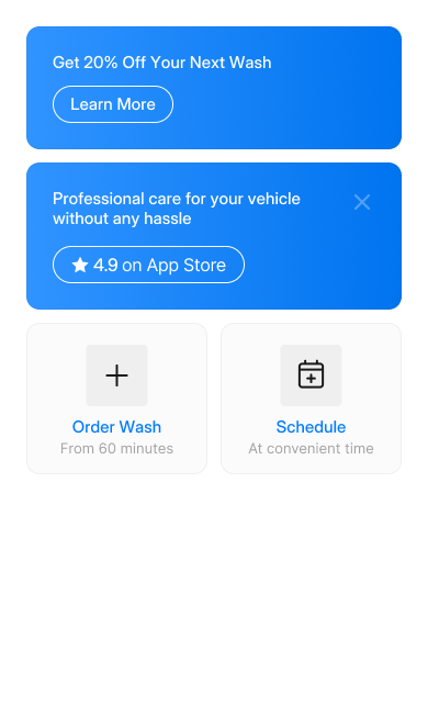 Пользователь может оформить мойку на ближайшее время или заранее запланировать визит. Интерфейс приложения делает основные действия простыми и понятными с первого экрана.